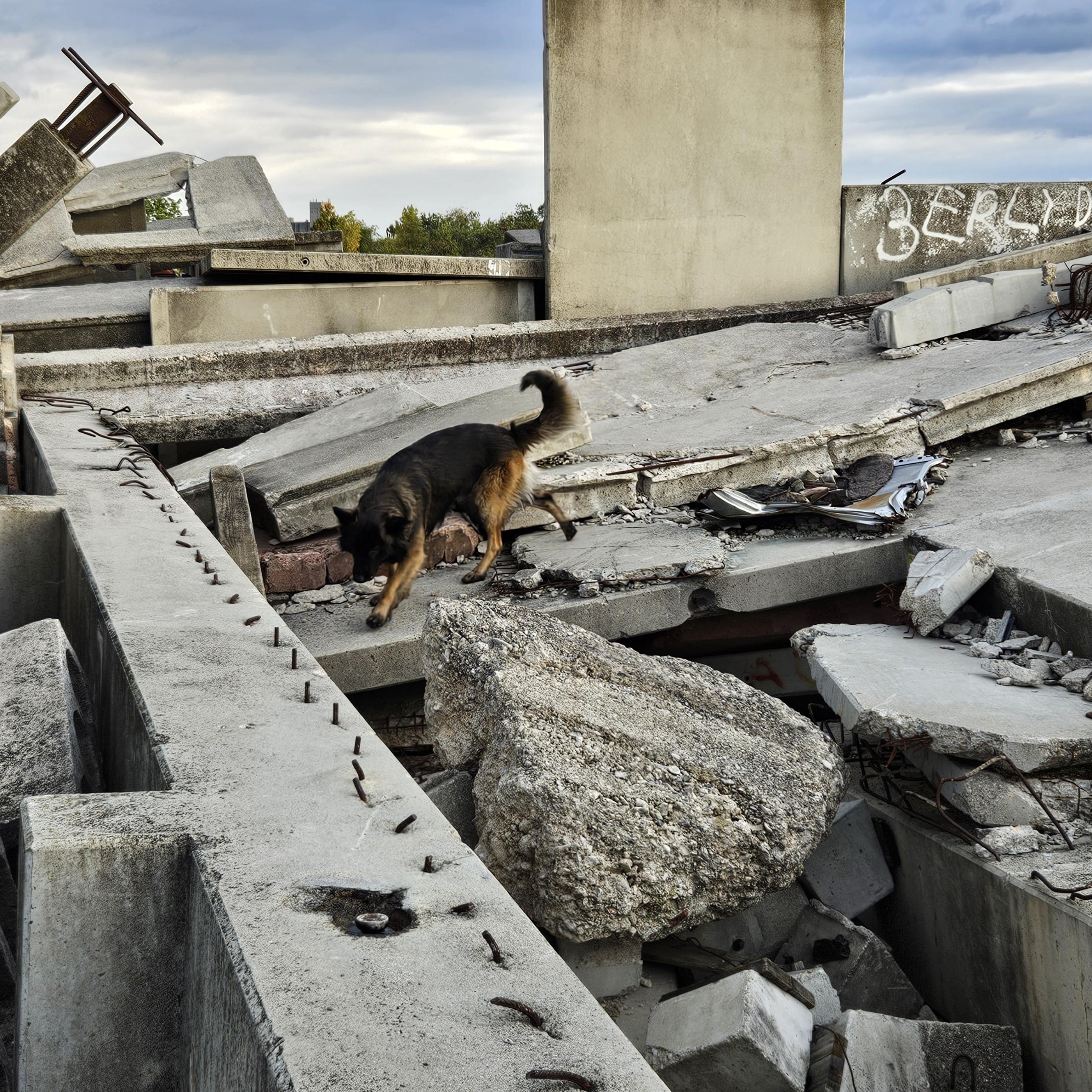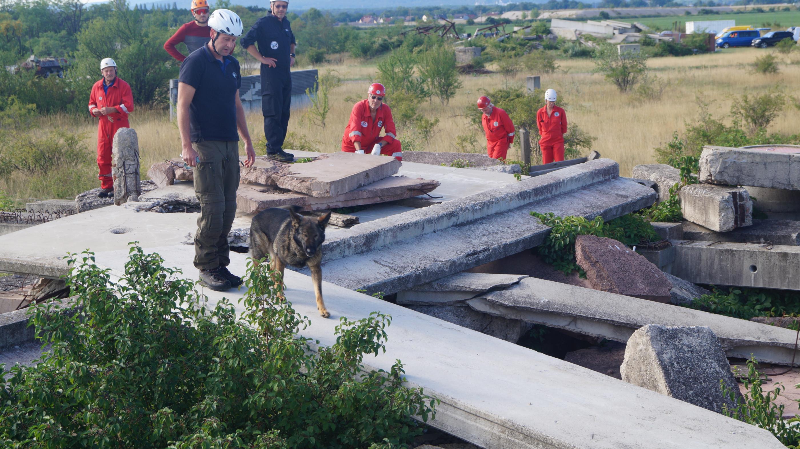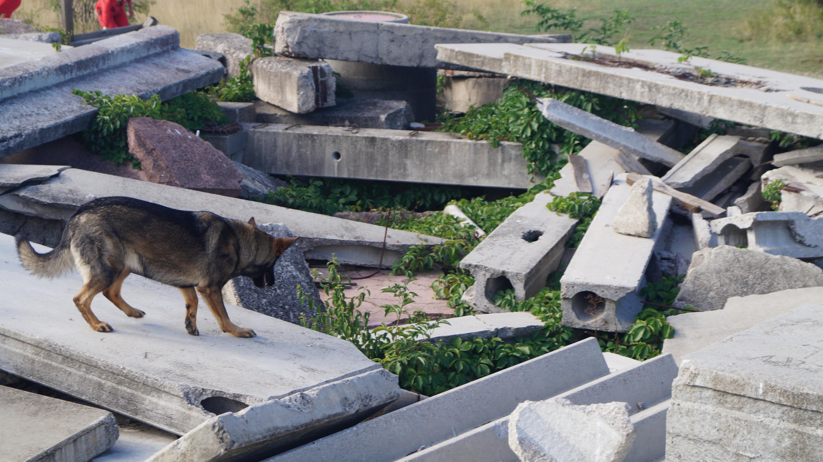 Im Gegensatz zur Lawine, wo der Hund möglichst schnell sein soll, gilt hier: Extrem langsam bewegen! Zu groß ist die Gefahr, sich mit einem spitzen Gegenstand, wie Glasscherben, Betoneisen und dergleichen zu verletzen. Der Hund muss lernen, sein Gewicht auf den Betonplatten geschickt von einer Pfote auf die andere zu verlagern. Durch Begehen der leichteren Schadstellen können sich die Hunde langsam auf die ungewohnten Suchverhältnisse einstellen.